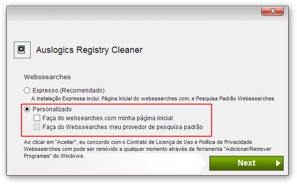 Durante o processo de instalação, algumas telas são exibidas, em sequência, oferecendo itens extras ao procedimento. Na primeira, você pode transformar o “Websearches.com” na sua página inicial dos navegadores e, também, no mecanismo-padrão de busca a ser adotado. Para evitar essas alterações, selecione a opção “Personalizado” e desmarque as duas opções presentes na tela.